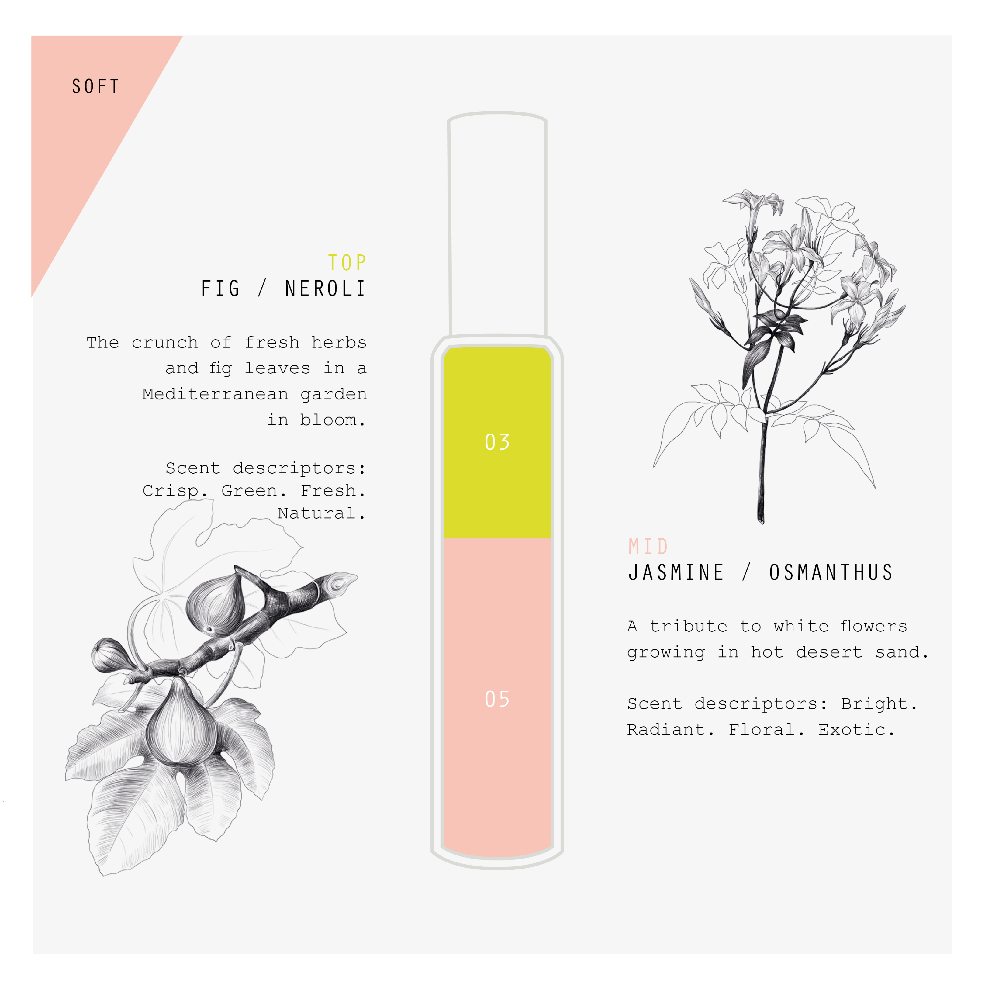 Featuring a minimalist blend of the ingredients we love, Fig Neroli brings together the comfort of orange blossom absolute, the brightness of neroli and the greenness of fig leaves, basil and petitgrain. Contrasted with the earthiness of vetiver and Virginian cedarwood and the warmth of iris and benzoin, this fragrance is evocative of a meditative summer walk in a Mediterranean garden at the end of a hot day.