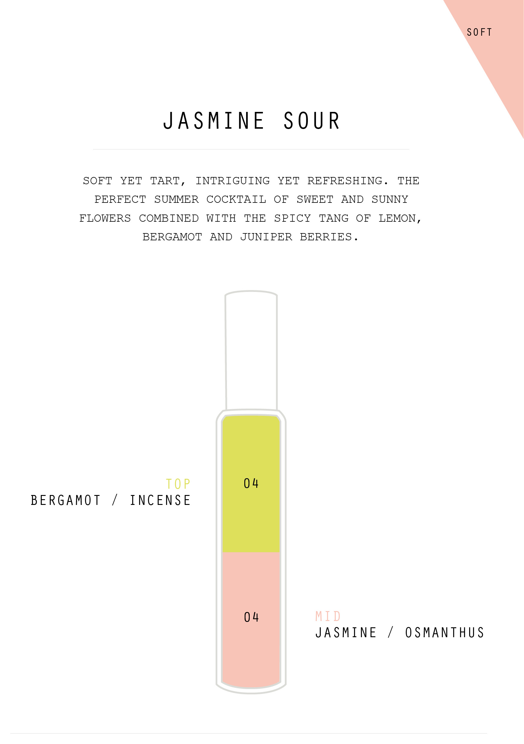 Jasmine Sour blends our Essential Jasmine Osmanthus with Bergamot Incense in this zingy and delicate cocktail of creamy white flowers – jasmine, osmanthus and frangipani with a touch of coconut – coming together with the sharpness of citrus and spices – lemon, bergamot and juniper berries.