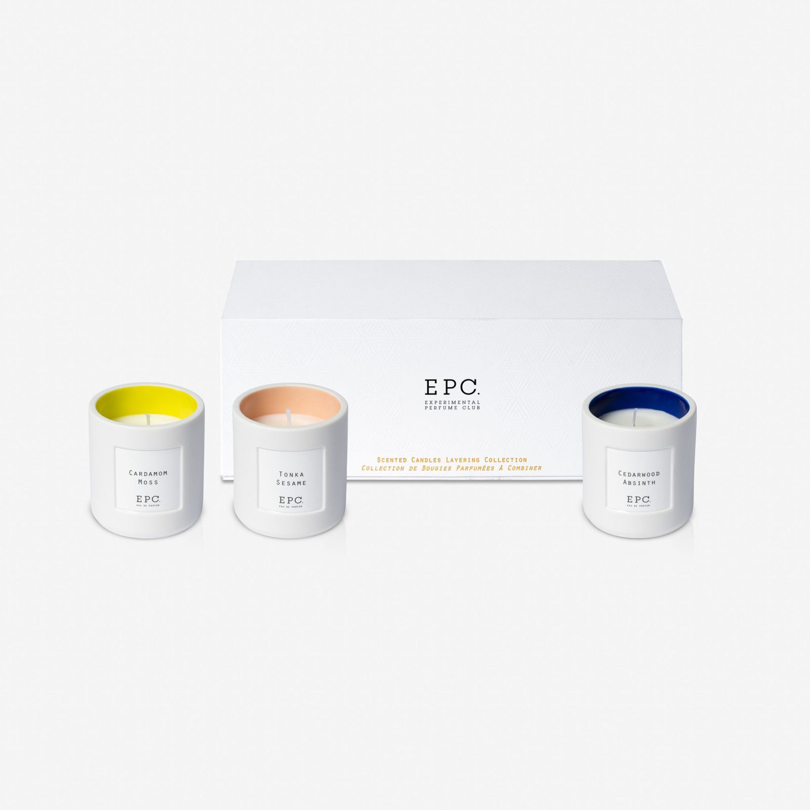 Each candle represents a different layer of the fragrance pyramid: top, mid, and base.